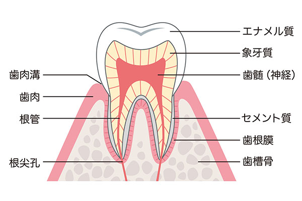 歯の中には、神経や血管が束になった「歯髄」と呼ばれる組織があります。歯髄は歯に酸素や栄養を届ける働きを担っていますが、むし歯が進行したり、外傷によって感染や炎症が起きた場合には、歯髄を除去して症状を改善する「根管治療」が必要です。