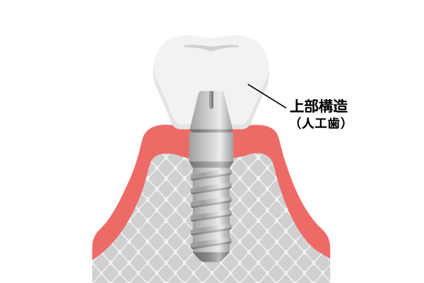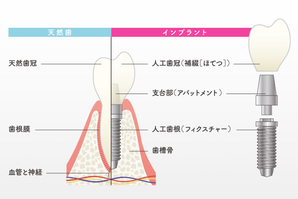 インプラントとは、チタンやチタン合金でできた人工歯根をあごの骨に埋め込み、その上に人工歯を装着して歯の機能を回復する治療です。チタンは骨としっかり結合する性質(オッセオインテグレーション)があるため、高い安定性と耐久性が期待できます。