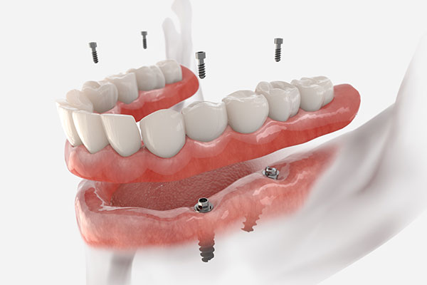 「All-on-4」は、4本のインプラントで片顎の義歯を支える治療法です。すべての歯を失った方や、従来の総入れ歯が合わない方に適したインプラント治療の選択肢で、少ない本数でしっかり噛める義歯を支えられるのが特徴です。身体への負担や費用負担を軽減します。また、All-on-4によって、骨の量が少ない方でもインプラント治療が可能になるケースもあります。