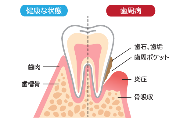 歯周病は、お口の中にいるいくつかの細菌による感染症で、歯を支える骨や歯ぐきが徐々に壊れていく病気です。