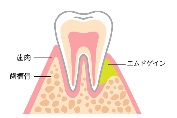 エムドゲインは、豚の歯胚(歯のもとになる組織)から抽出したエナメルマトリックスというタンパク質を主成分とした歯周組織再生のための薬剤です。歯の発生過程を再現するような環境をつくることで、歯周病によって失われた組織の再生を促します。この治療薬はスウェーデンで開発され、歯周再生療法のひとつとして広く使用されています。