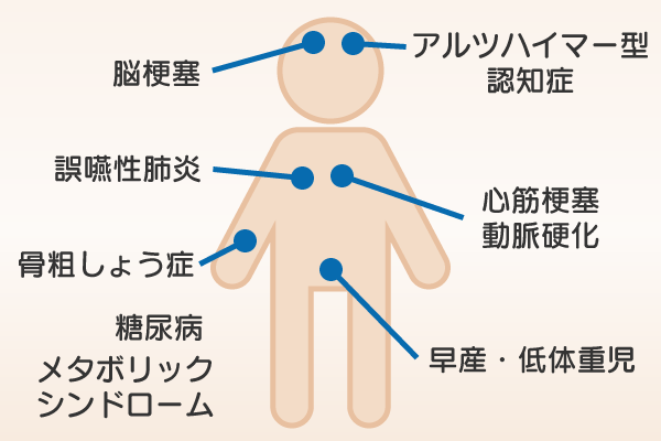 近年、歯周病と全身の病気との関連が注目されています。たとえば、動脈硬化や心疾患などの循環器系疾患、誤嚥性肺炎の原因になることや、糖尿病との相互関係が報告されています。また、アルツハイマー型認知症や骨粗しょう症、さらに妊婦さんにおいては早産や低体重児出産のリスクを高めることも分かっています。